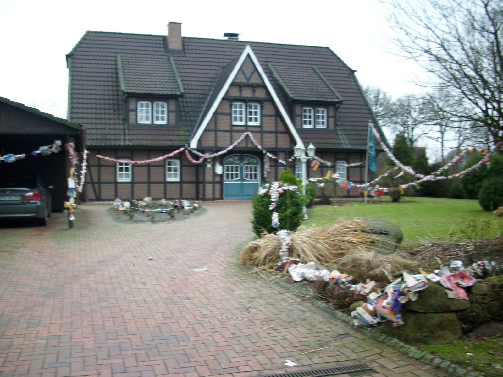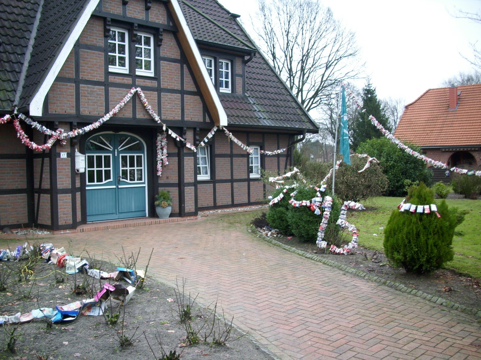 Eine fröhliche Schachtelinvasion rund um das Aukamp´sche Anwesen herum. Irgendwer war so nett und hat sogar noch seinen ganzen Müll unter Mamas Buxbaum gekippt. Naja, bei dem ganzen Papiermüll, kann das schon mal passieren. Aber mal im Ernst, gigantisch was ihr da aufgefahren habt. Welch ein Schachtelkranz! Unzählige. Und ich muss es wissen, ich habe die ganzen Schachteln am Sonntag auf unseren Dachboden geschleppt. Wusste gar nicht wie viel Wasser so eine Pappschachtel speichern kann. Unser Boden gleicht nun jedenfalls einer Altpapiersammelstelle und das noch bis März 2012. Da wird nämlich erst das nächste Geburtstagskind 25, das Anrecht auf diesen Kranz hat.