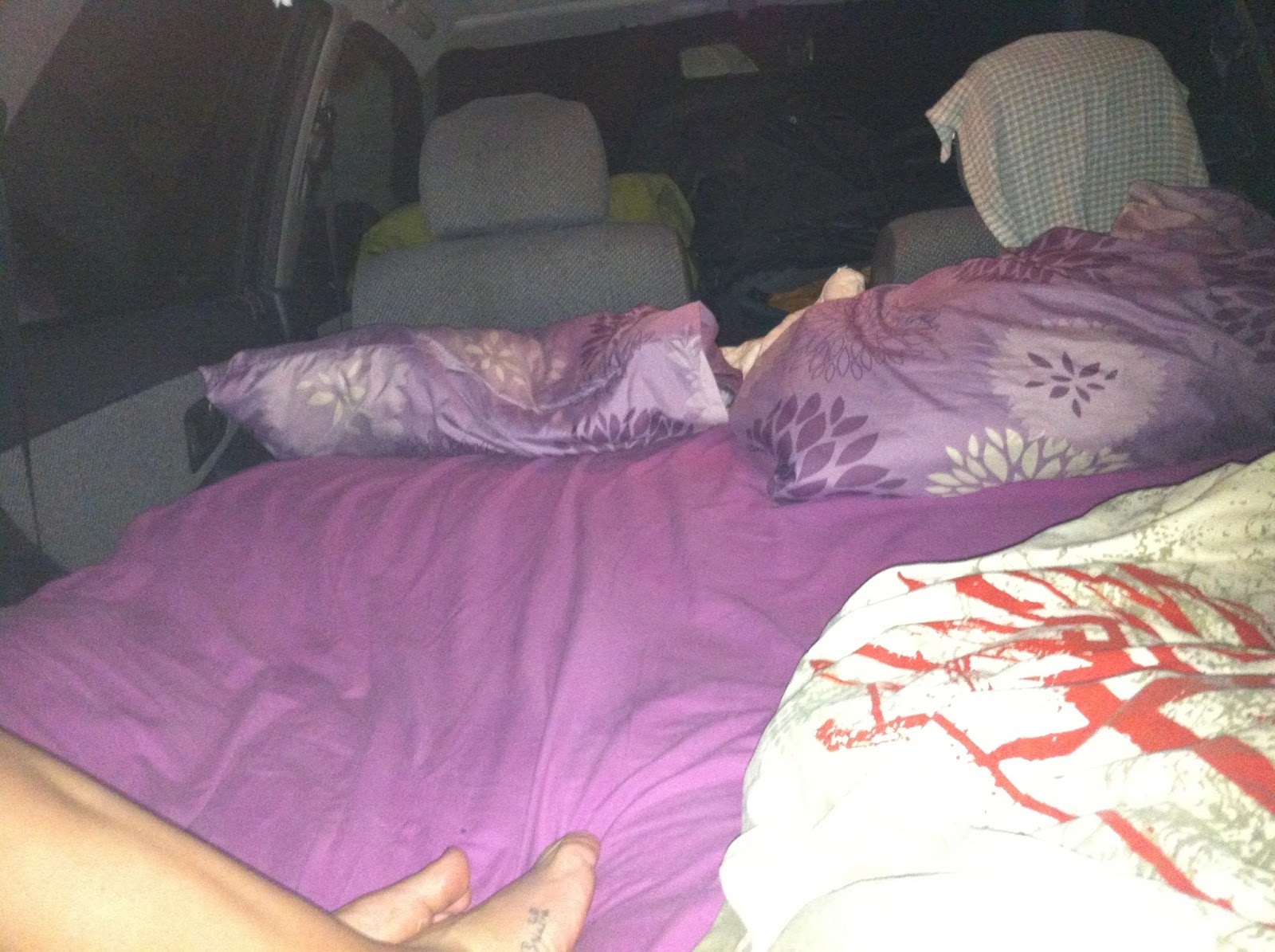 Und ich sags euch. Man hat mir nicht zu viel versprochen! Paul ist besser als jedes verdammte Kingsize-Bett! Er hat einen überdimensionalen Kofferraum. Da passen locker zwei, wenn nicht sogar drei Menschen nebeneinander rein. Und ich habe wunderbar flauschige, lila Bettwäsche für meine Decken und Kissen. Ein weiterer wunderbarer Nebeneffekt ist, dass wenn ich mich mit dem Kopf zur Kofferraumklappe lege, ich den Sternenhimmel aus dem Auto heraus beobachten kann. Und wer schon mal in der südlichen Hemisphäre war, der weiß, dass der verdammte Sternenhimmel hier einfach atemberaubend ist. Und ich kann diesen Himmel nun von meinem Bett aus sehen.